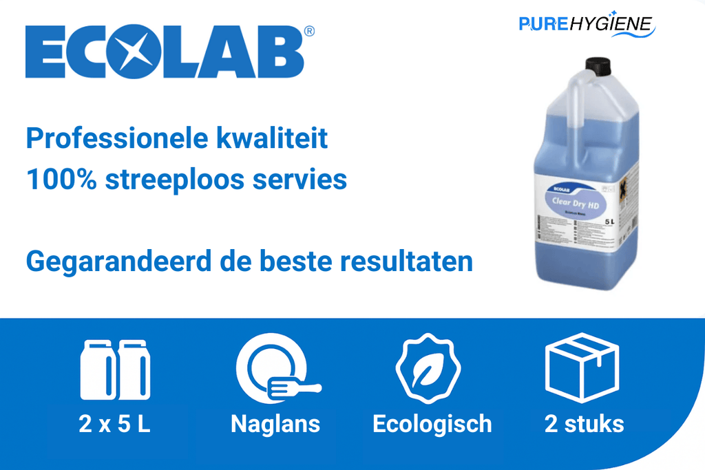 Ecolab Clear Dry HD , hochkonzentrierter Klarspüler, hartes Wasser. Streifenfreie Ergebnisse treten vor allem bei hartem Wasser auf. Reduziert Kalkablagerungen beim Spülen. In Kombination mit Ecolab-Geschirrspülprodukten garantiert es hygienischste, strahlendste und saubere Ergebnisse. Eine optimale Benetzung der Tenside garantiert ein streifenfreies Trocknen des Geschirrs. Dadurch wird das Risiko des Bakterienwachstums minimiert.