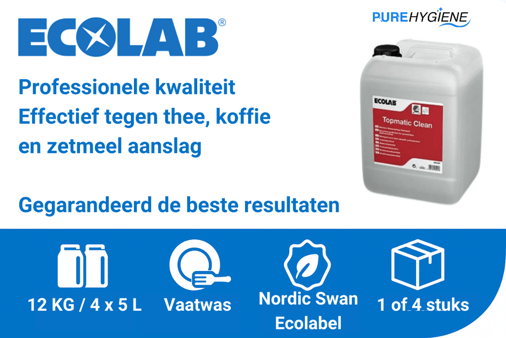 Ecolab Topmatic Clean ist ein flüssiges Geschirrspülmittel, das für mittlere Wasserhärte geeignet ist. Es ist sehr wirksam gegen Tee-, Kaffee- und Stärkeablagerungen. Das Geschirrspülmittel trägt das Nordische Umweltzeichen Schwan. Dieses Geschirrspülmittel ist nicht für empfindliches Geschirr geeignet, für das wir Ecolab Topmatic Crysta l empfehlen. Verwenden Sie dieses Reinigungsmittel nicht für Aluminium oder andere weiche Metalle.