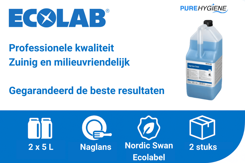 Ecolab Toprinse Clean ist ein neutraler Klarspüler, der den Trocknungsprozess von Geschirr beschleunigt und strahlende Ergebnisse erzielt. Toprinse Clean enthält einen hochwertigen Luftbefeuchter, der eine zusätzliche manuelle Trocknung überflüssig macht.
