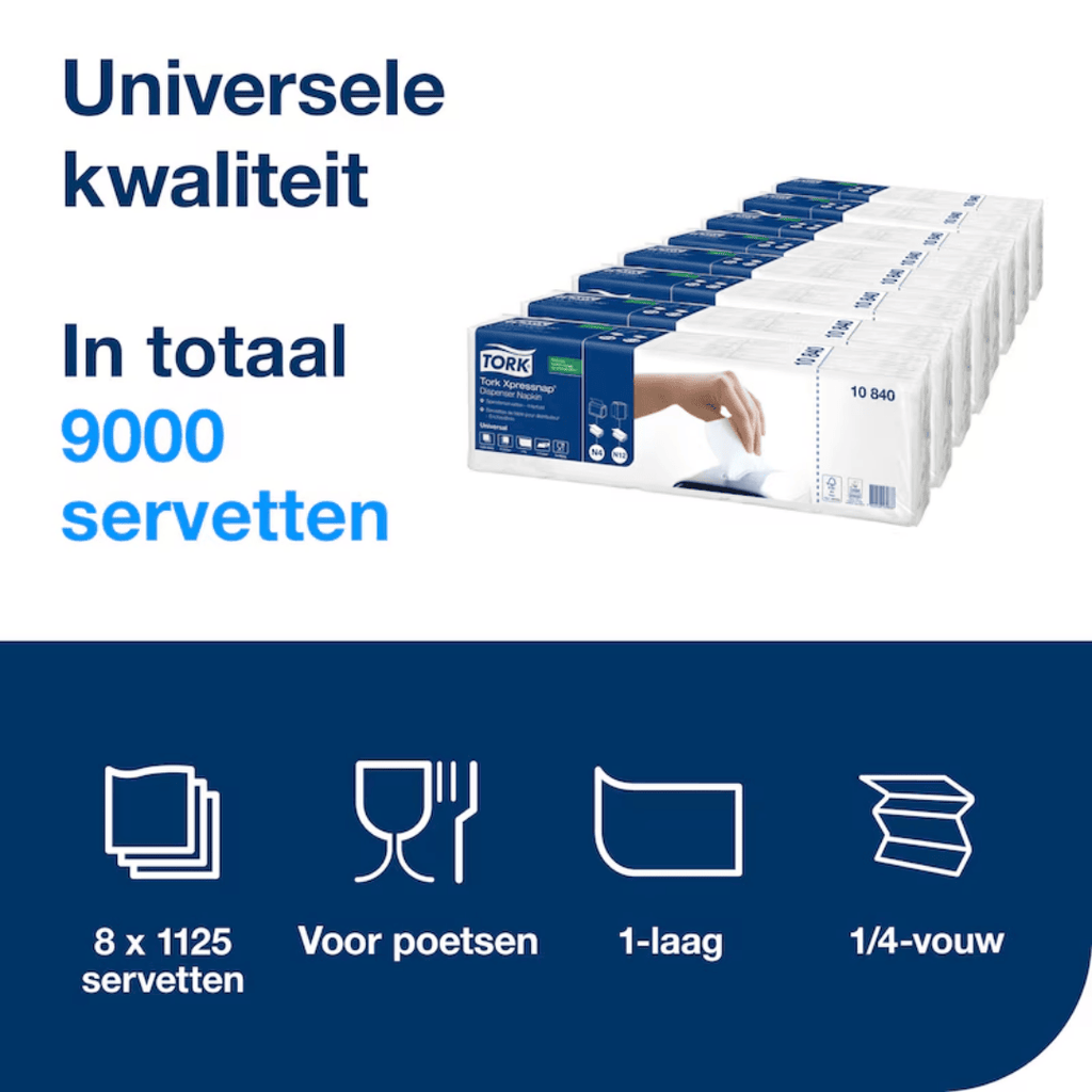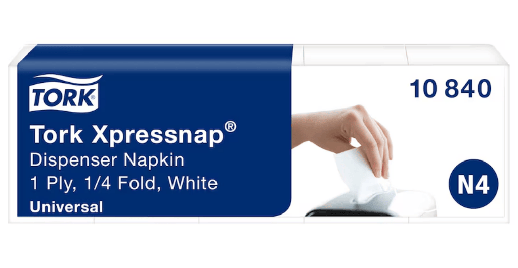 Die Tork 10840 Servietten sind in Kunststoff verpackt, wodurch sie hygienisch und einfach aufzubewahren sind. Darüber hinaus lässt es sich leicht austauschen, was dem Personal Zeit spart. Das Tork Xpressnap® Spendersystem kann Ihrem Unternehmen helfen, den Serviettenverbrauch im Vergleich zu herkömmlichen Serviettenspendern um mindestens 25 % zu reduzieren.