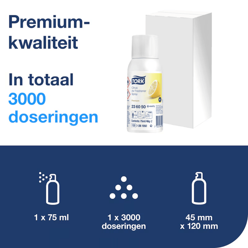 Zorg voor een hygiënische geur met onze Tork 236050 Citrus Luchtverfrisser. De spray bevat geconcentreerde oliën die de geur neutraliseren. Met deze luchtverfrisser hoeft u zich nooit meer zorgen te maken om onaangename geuren in sanitaire ruimtes.