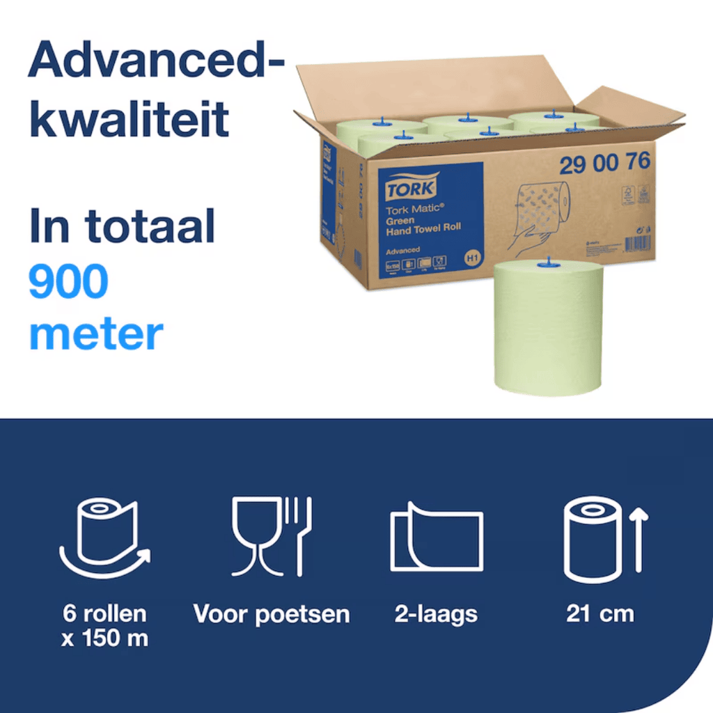 Deze Tork Matic 290076 Groene Handdoekrollen zeer erg dik en goed absorberend om extra snel de handen te drogen. Deze handdoekrol is geschikt voor in een Tork H1 dispenser. De dispenser is gemakkelijk bij te vullen en controleert het verbruik via vel voor vel dosering.