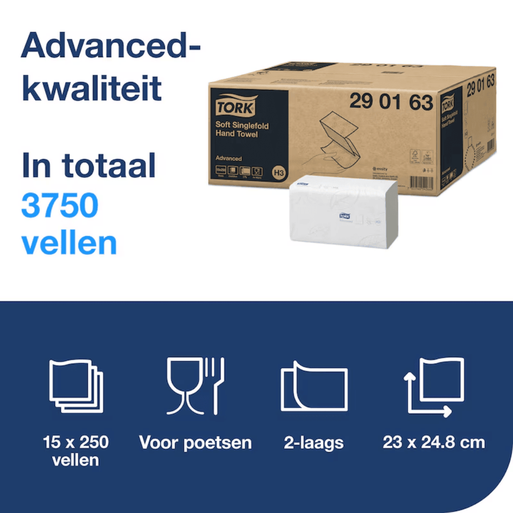 Tork 290163 Advanced Handdoekpapier van zeer hoge kwaliteit. Geschikt voor in Tork H3 dispensers. Vel voor vel dosering voor extra hygiëne. Bevat een aantrekkelijk ontwerp wat een goede indruk zal achterlaten bij uw bezoekers.