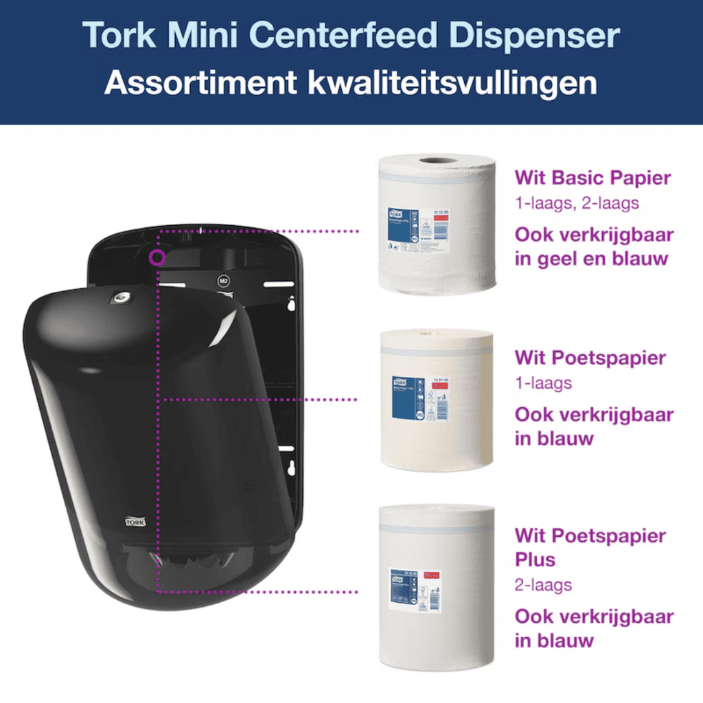 Dieser schwarze Tork 559008 Centerfeed-Reinigungspapierspender verleiht der Umgebung, in der Sie ihn haben, ein luxuriöses Aussehen. Sehr gut geeignet in Umgebungen, in denen Hände und Oberflächen gereinigt werden müssen. Der Spender verfügt über einen Freilauf, sodass Sie so viel Papier entnehmen können, wie Sie möchten.
