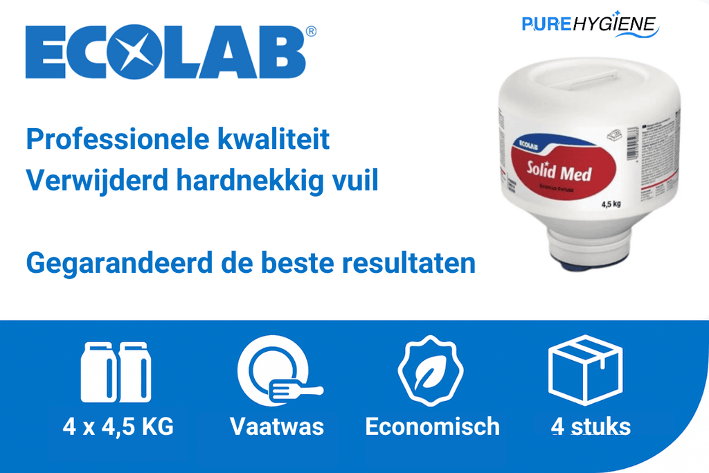Ecolab Solid Med is een sterk blekend vaatwasmiddel en is niet geschikt voor gebruik op zachte metalen zoals aluminium. Het wordt verkocht per 4 x 4,5kg doos.